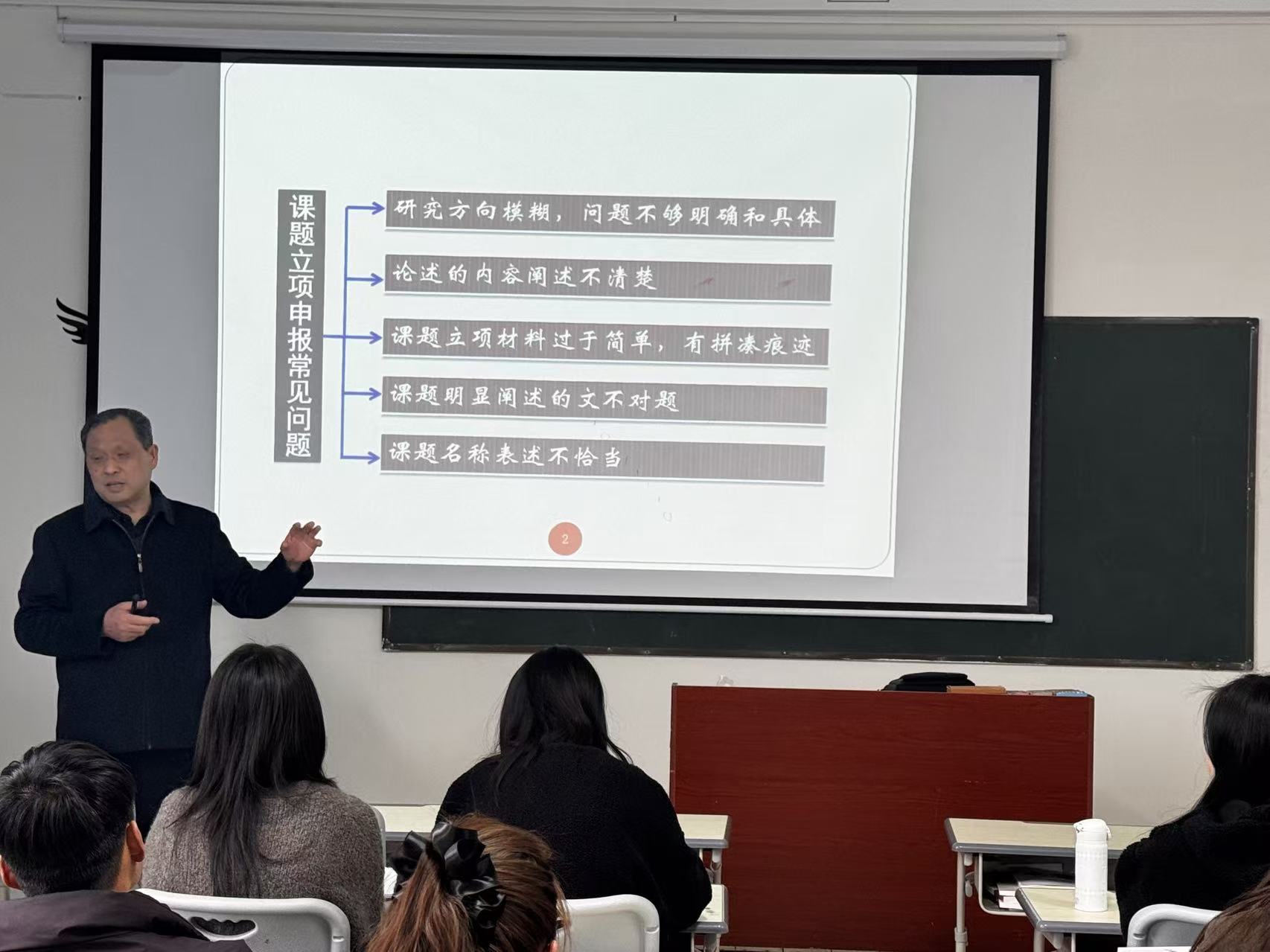 刘广军教授结合自身丰富的项目申报经验,围绕选题策划、申报书撰写、研究设计、成果梳理等关键环节进行了系统讲解。刘教授强调,选题要立足教学实际与政策导向,做到“小切口、深研究”;申报书撰写要结构规范、逻辑清晰、亮点突出;研究设计要科学可行,确保项目落地见效。同时,刘教授还梳理了项目申报中的常见误区,并提出针对性规避建议。