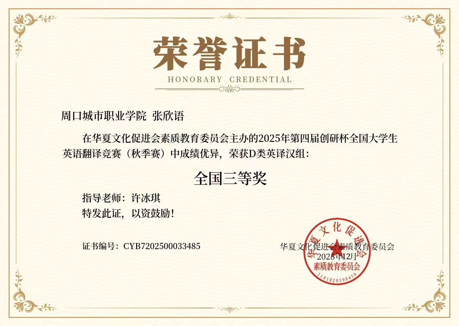 近日,2025年第四届“创研杯”全国大学生英语翻译竞赛(秋季赛)获奖名单正式公布。我校马克思主义学院英语组张宇欣、张闪闪、许冰琪三位老师指导的五名学生脱颖而出,荣获多个国家级奖项。具体获奖情况为:赵欣然荣获汉译英组全国二等奖;胡姝鑫、李俊鹏、刘佳、张欣语四位同学荣获英译汉组全国三等奖。